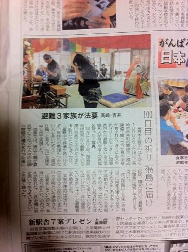 あの東日本大震災が発生して今日でちょうど100日。 当山では、縁により100ケ日法要を、近くの牛伏ドリームセンターに避難されている被災者様方と共に勤めさせていただきました。 地震・津波の被害はいわずもがな、今なお収束する見通しのない原発事故の影響は酷いモノです。 拙僧も2度、福島県南相馬市に伺い、ボランティア活動及び慰霊を勤めさせていただきましたが、まだまだこれからでございます。