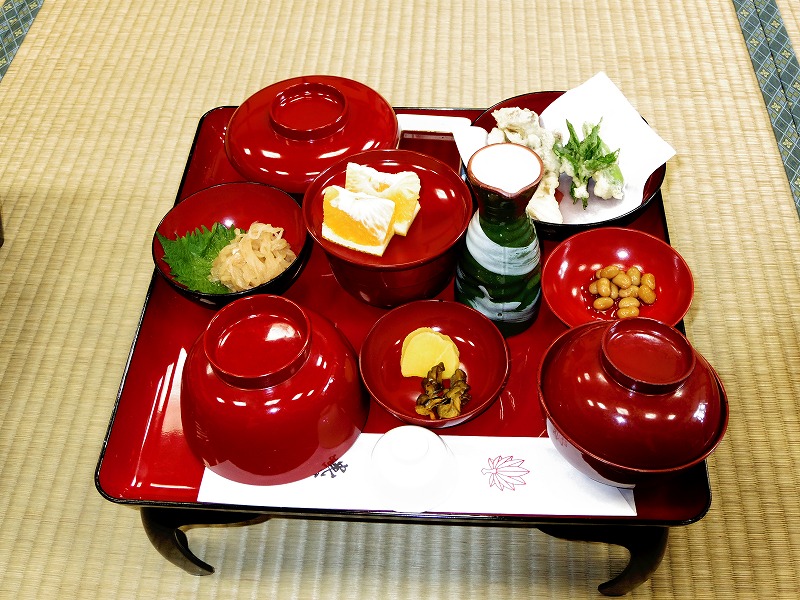 ご厚意により食事を用意していただきました。 皆が精進料理を楽しんでいただきました。 |